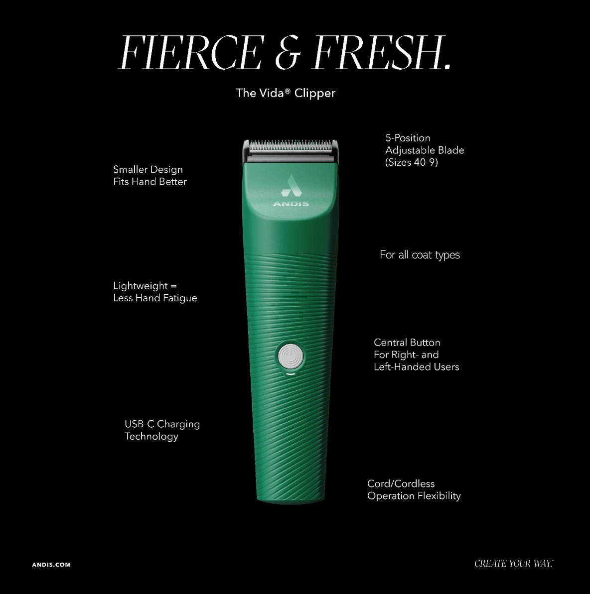 Your creativity speaks for itself when wielding this trimmer. Designed for all coats and sizes, the slim profile is easy to hold, so it’s safer when animals fidget. From show cuts to full-body clips, lay down clean styles and patterns in a heartbeat. High-quality blades adjust easily to multiple lengths without compromising precision. A convenient USB-C charger keeps your creative juices going, no matter if you’re in the stables, grooming salon, or on the road. Whether it’s setting crisp lines or polishing off that show circuit look, the Vidaâ„¢ helps you bring out the best.Â