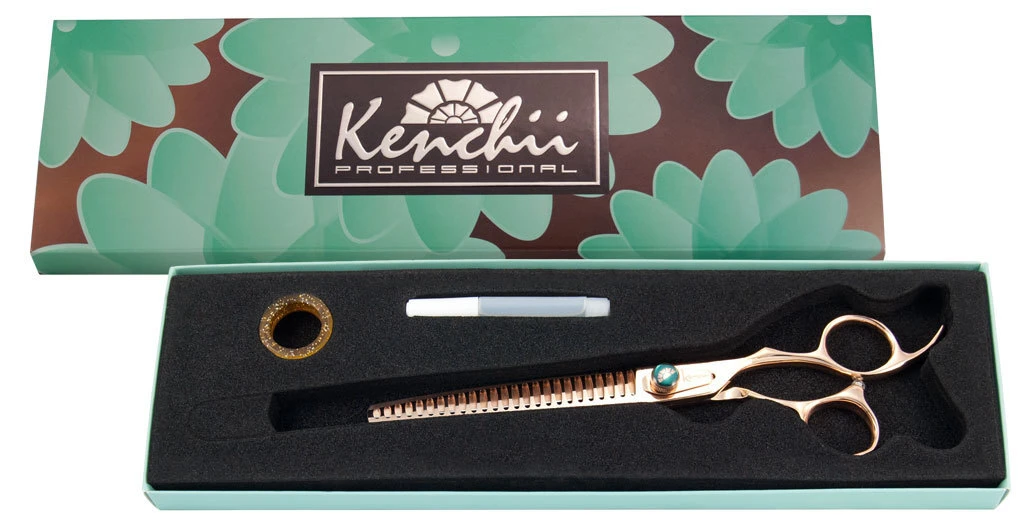 Kenchii Rosé scissors and thinners are made from our proprietary level 2 Japanese molybdenum materials enrobed with rose gold titanium. Semi-convex, microserrated edge is designed to reduce slippage and enhance cutting performance. Great for everyday grooming.