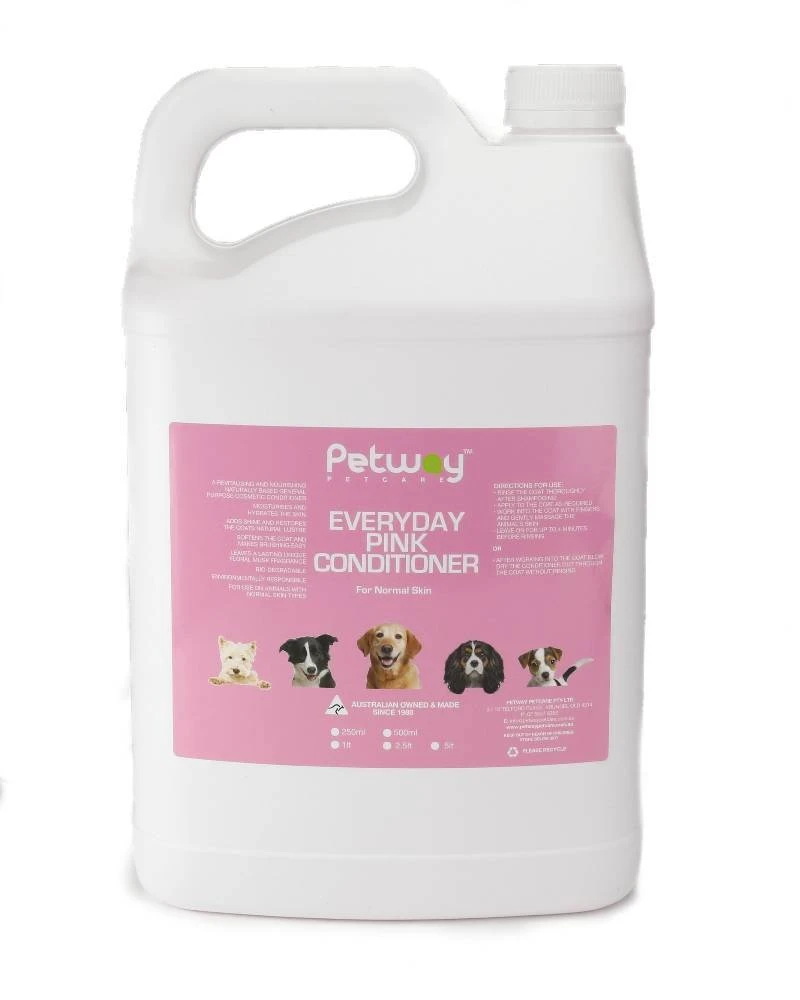 Petway Petcare Everyday Pink Conditioner a revitalizing and nourishing naturally based, general purpose cosmetic conditioner for normal skin types, that adds shine and restores the coats natural lustre, while invigorating the skin. It will soften the coat and make brushing easy. Easily rinsed out or can be blown out through the coat with dryer. Leaves a lasting unique floral spice fragrance that matches our popular Petway Petcare Everyday Pink Shampoo, however, it can be used in conjunction with all Petway Petcare Shampoos.
